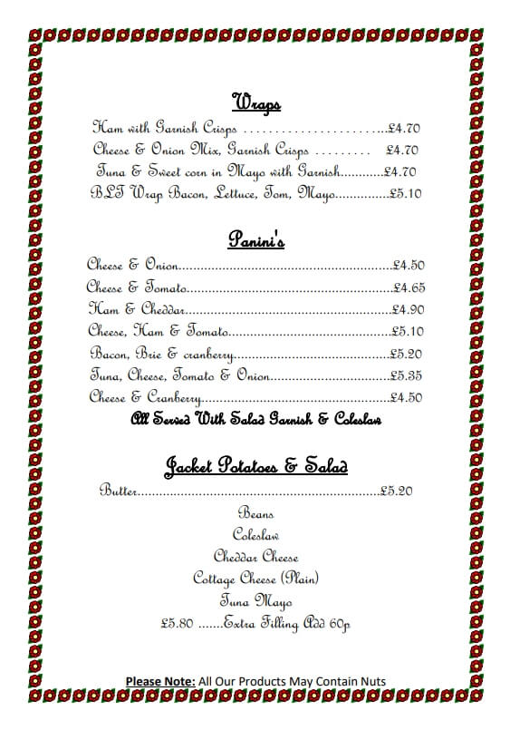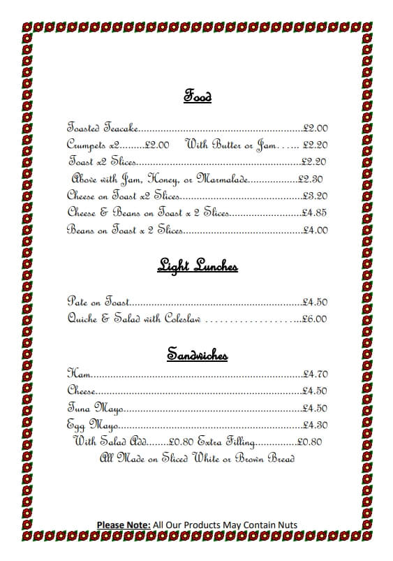 Breakfast is served until mid-day, every day and ranges from tea & toast to the full English. Lunches are available from 12 pm to 4 pm daily and we change our specials menu each day.